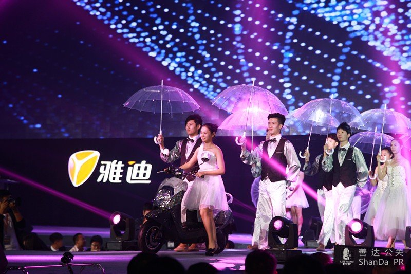 在晚宴流程上我们将“星”概念更是运用到了极致:首先是创先河的在电动车行业策划了雅迪经销商,合作伙伴和明星(孙楠,平安,张碧晨,张也等多位明星)一起走红毯仪式,这个仪式现场效果非常好,得到了很多行业媒体的大量免费报道;在颁奖环节和颁奖视频上,我们利用虚拟技术让所有人都体验了“做超级明星”的感觉,恒星——代表雅迪董事长、四大行星——代表核心的四大经销商、108星宿——代表108个雅迪经销商、小行星——代表所有的雅迪员工及用户,所有星星围绕着恒星转动,寓意雅迪董事长将会带领大家,突破重围,引领电动车产业更高端升级!